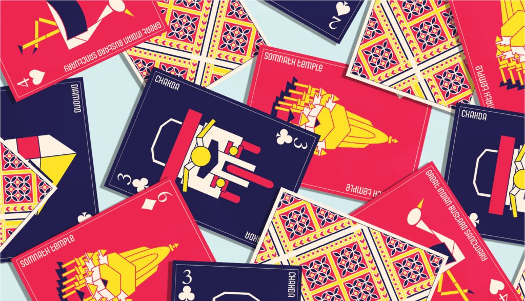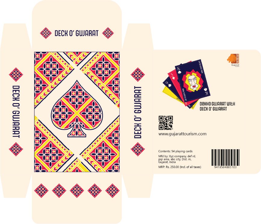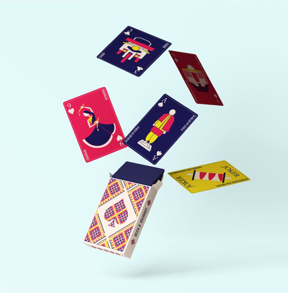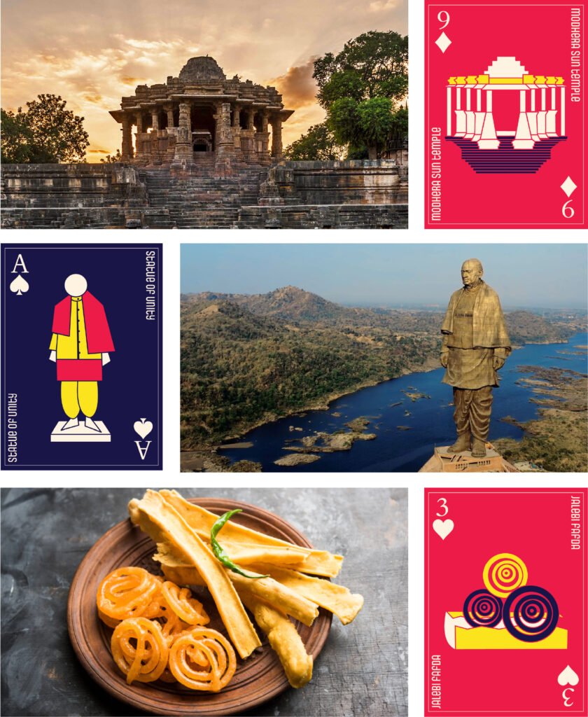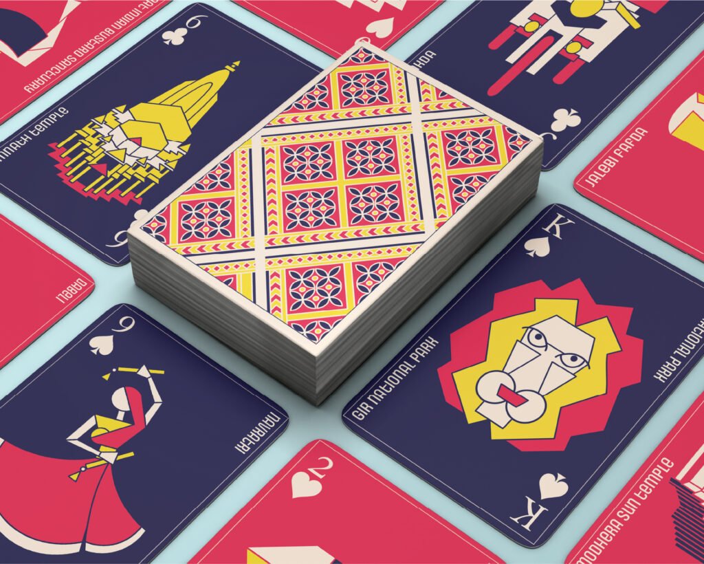A deck of illustrated cards featuring Gujarat’s culture and landmarks (with their respective names), sold near tourist spots to spark interest and promote state tourism.